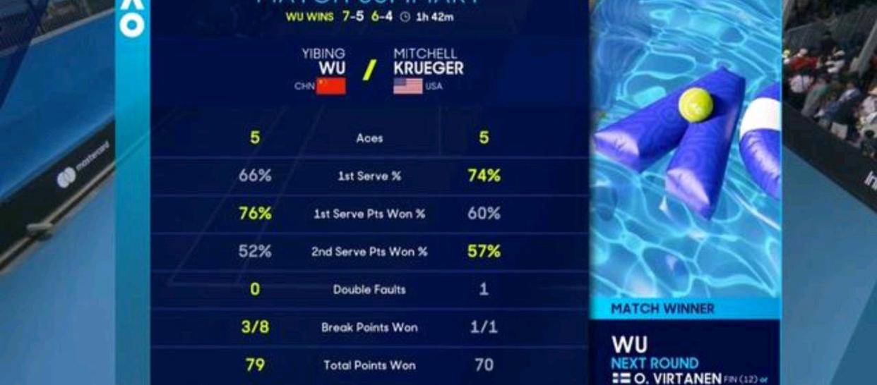 回顾整场比赛,技术统计也真实地反映了比赛的胶着与差距。双方在发球环节都表现出了极强的实力,各自轰出5记ACE球,可谓势均力敌。但网球比赛的胜负往往取决于细节的处理和得分效率的对比。克鲁格虽然一发成功率略高,但吴易昺凭借着更高的发球得分率,将自己的发球局打造成了“铜墙铁壁”,同时利用犀利的接发球和积极的底线进攻不断向对手施压。这种高效的攻防转换,正是吴易昺能够在如此激烈的比赛中脱颖而出的关键。