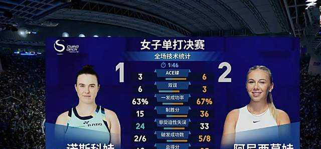 首盘比赛开始,阿尼西莫娃率先发球,表现强势并成功保发,接着在第2局、第4局和第6局连续破发,以6-0的比分取得首盘胜利。阿尼西莫娃的攻击极具威胁性,发球技术精湛,发球得分率高达91%,一二拍连贯流畅,轻松赢得分数,而诺斯科娃在首盘失分,陷入了困境。第一盘结束后,她离场去更衣室调整状态。