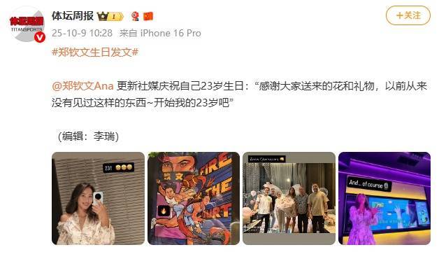 今日(10月9日)稍早时候,据体坛周报,郑钦文更新社媒庆祝自己23岁生日:“感谢大家送来的花和礼物,以前从来没有见过这样的东西,开始我的23岁吧。”